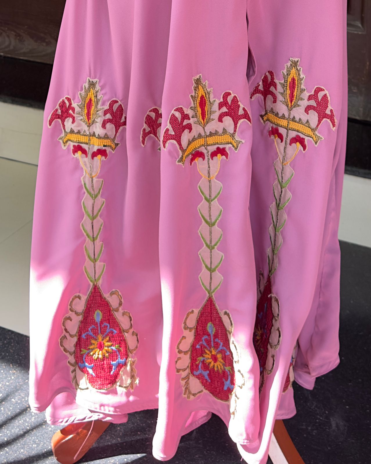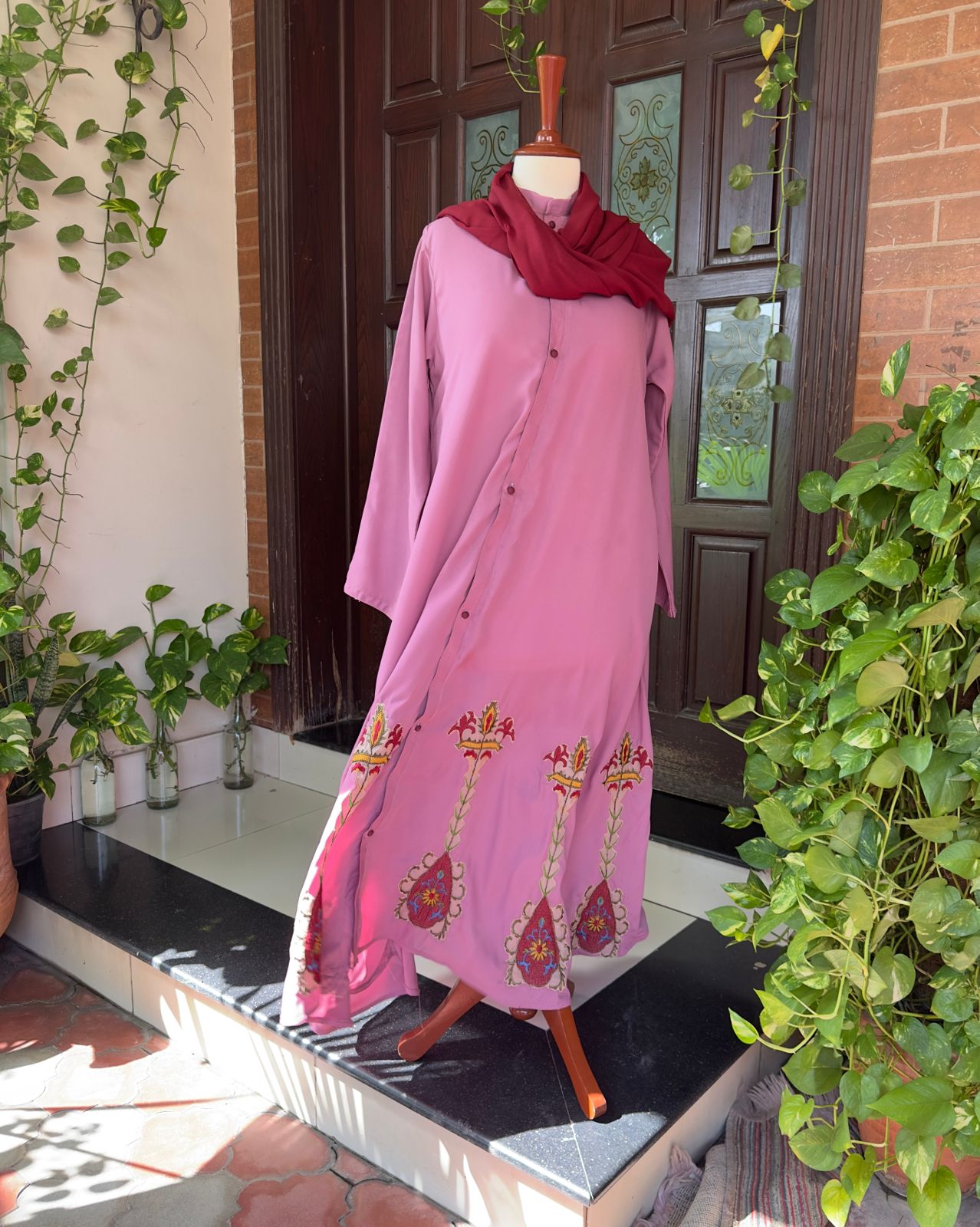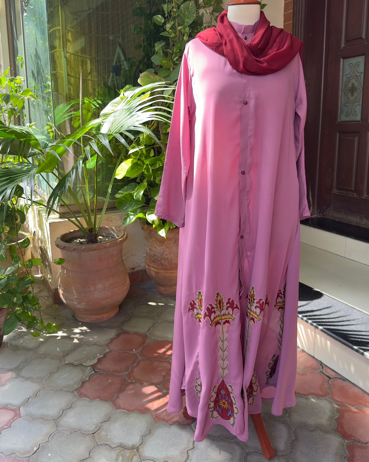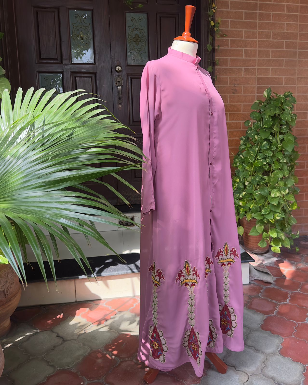 Refined elegance meets timeless modesty in our Pink Grace Abaya. Crafted from premium, flowy fabric, this design drapes effortlessly for a graceful and flattering silhouette. The abaya features intricate handcrafted embroidery along the lower panels, beautifully detailed in shades of red, gold, and green — adding a regal charm to its soft mauve base.