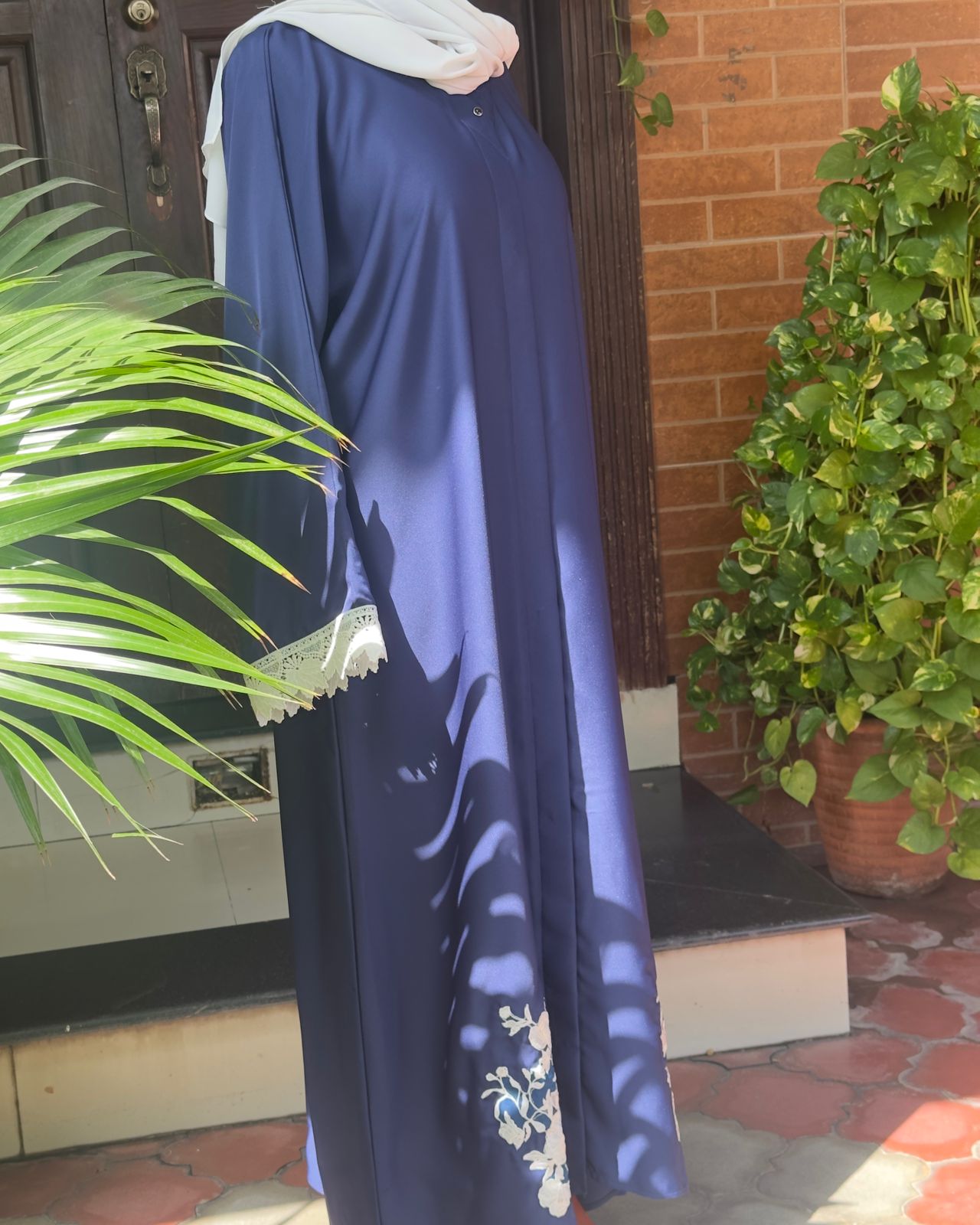 Navy blue abaya with delicate white lace detailing — a graceful blend of simplicity and style. 💙✨